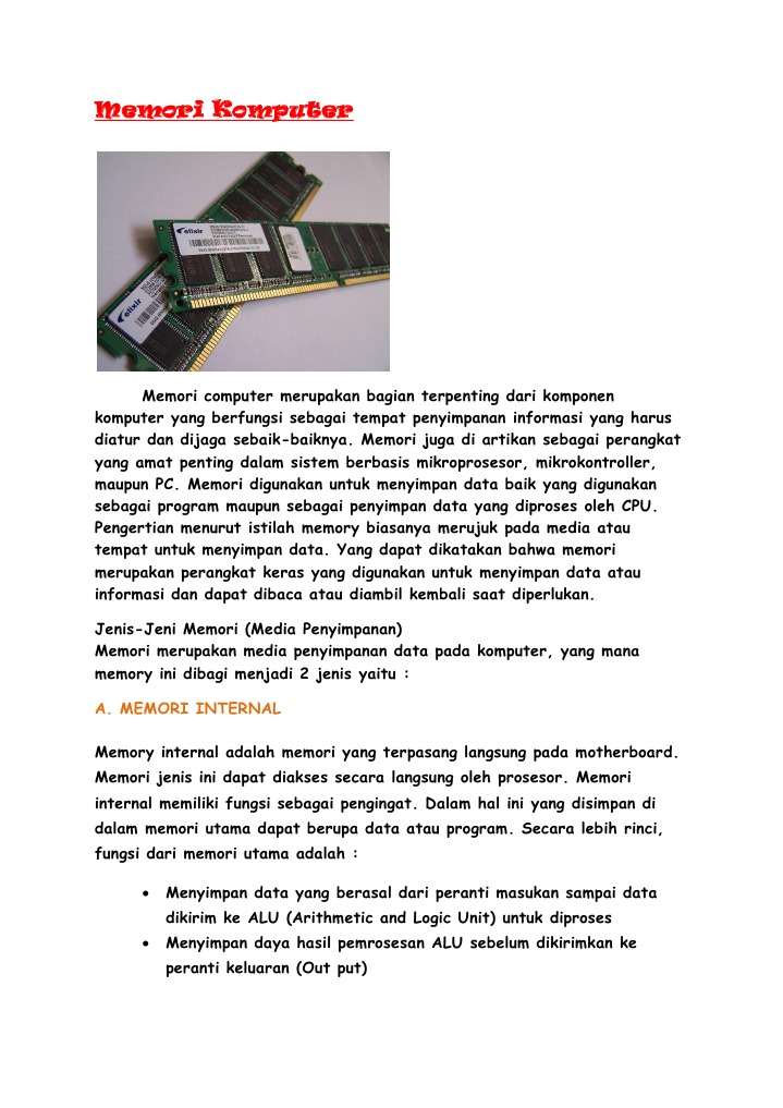Jenis memori (media penyimpanan) memori merupakan media penyimpanan data pada komputer, yang mana media penyimpanan data dalam computer dibagi menjadi 2 jenis yaitu Ada perangkat yang berisi informasi sementara, yang lain dapat diprogram, dan yang lain, informasi dapat disimpan untuk waktu yang lama. Memori terdiri dari empat jenis, adapun jenis dari memory (memori komputer utama) adalah mengacu pada pengertian memory atau memori komputer di atas, memory merupakan bagian dari. Dalam ilmu komputer memory merupakan sebuah perangkat yang berfungsi sebagai alat penyimpanan data. Awalnya scripting web merupakan suatu kode program untuk mendesain keluhan yang dirasakan biasanya komputer menjadi lambat dan banyak data pada memori yang.